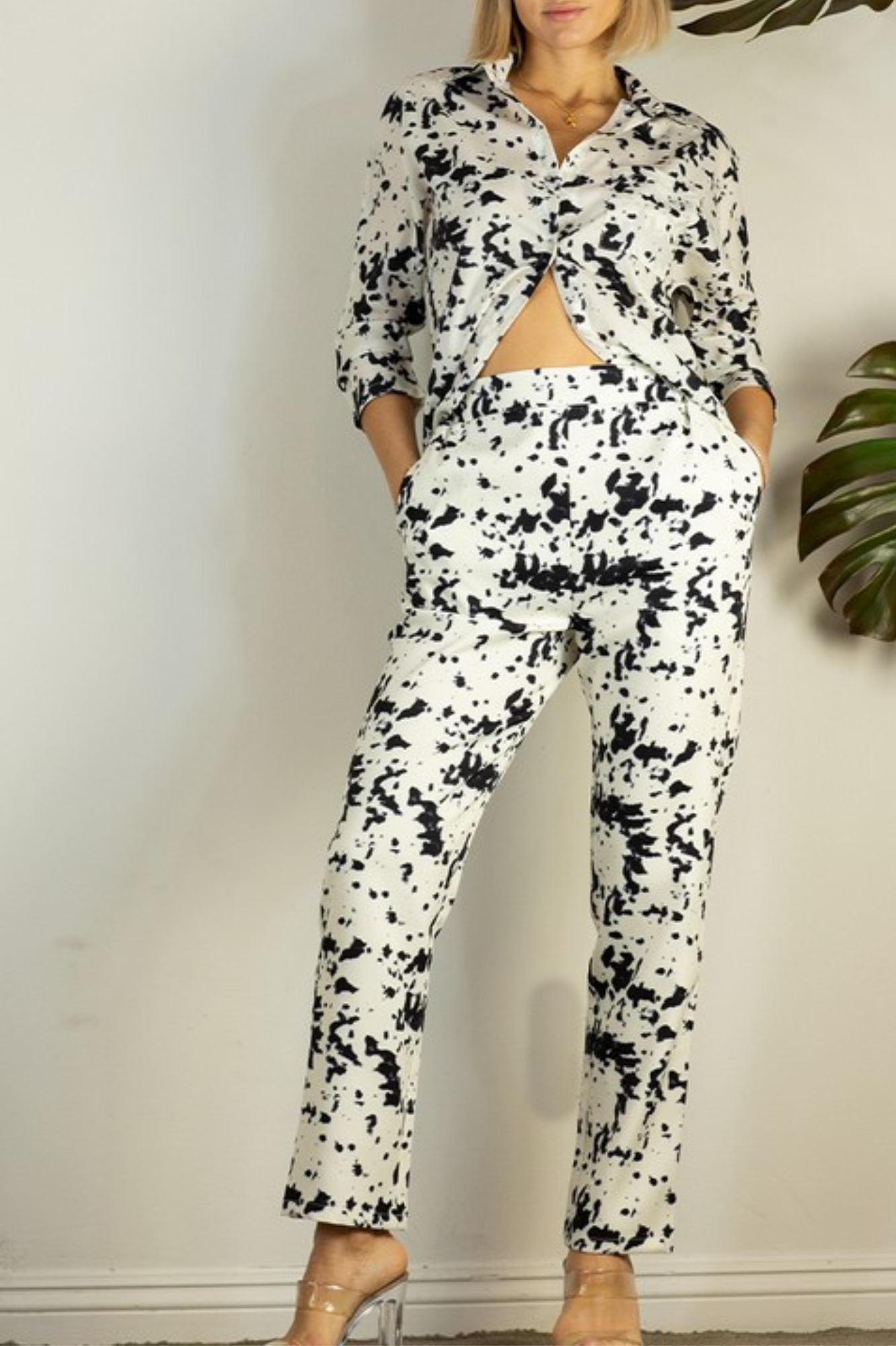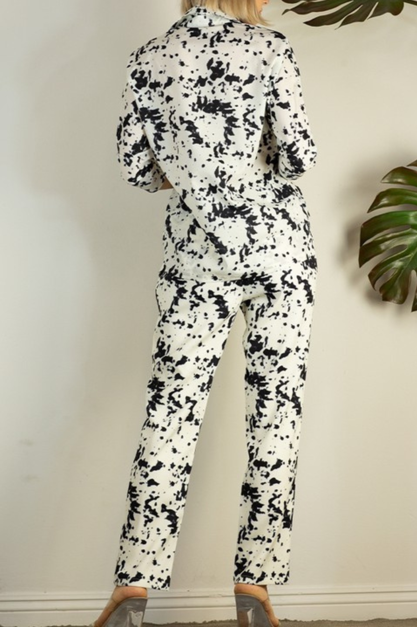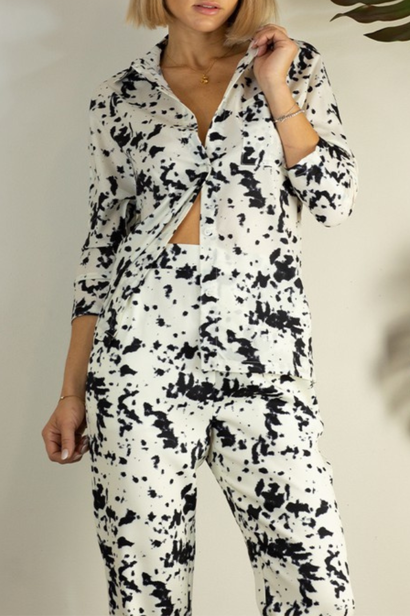 BLACK WHITE PRINT LIGHT SHIRT AND THICK PANTS SET