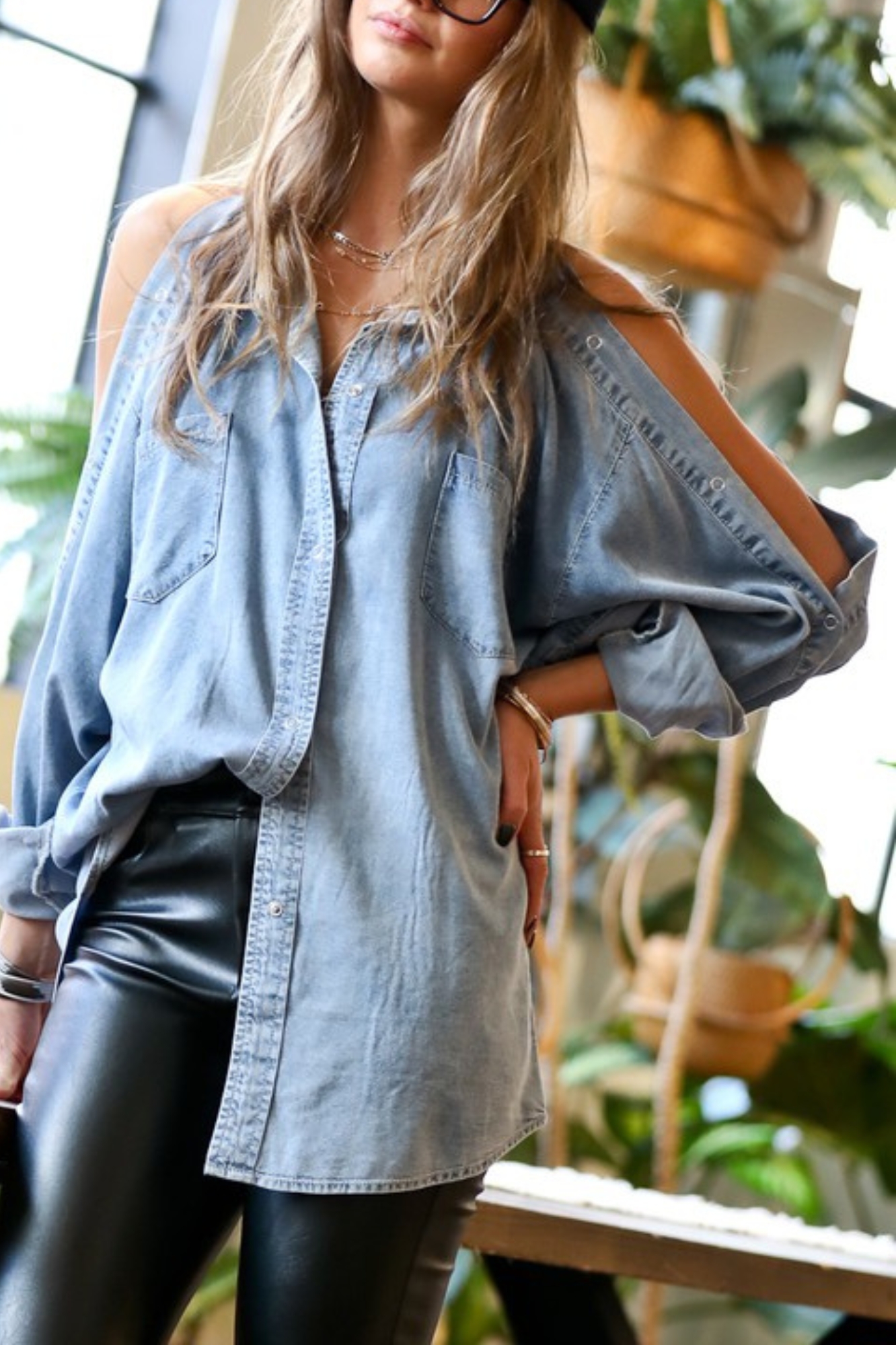 GREY EYELET OPEN SLEEVE WASHED OUT DENIM SHIRT