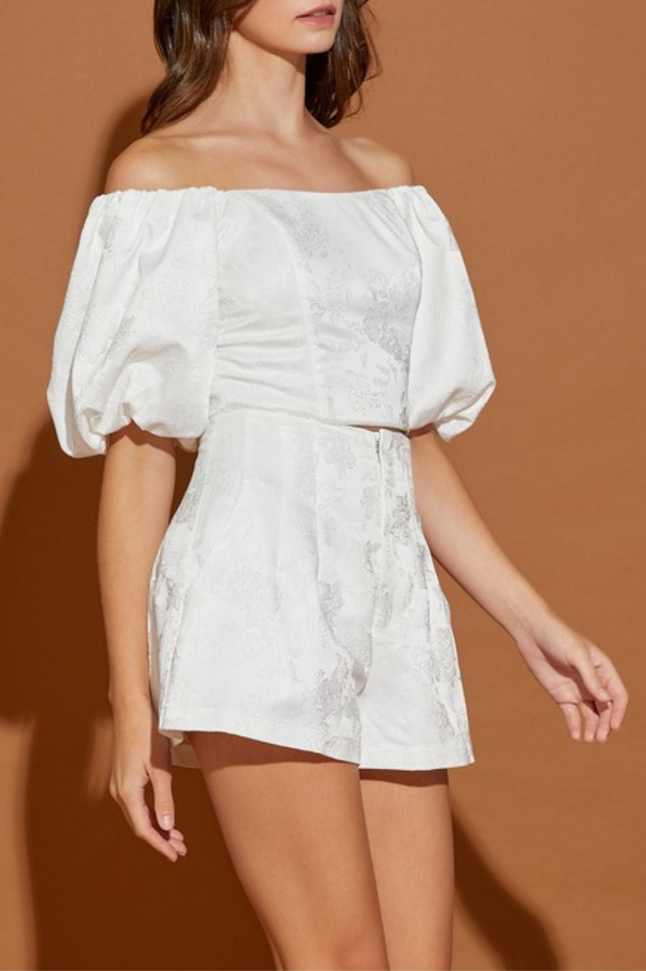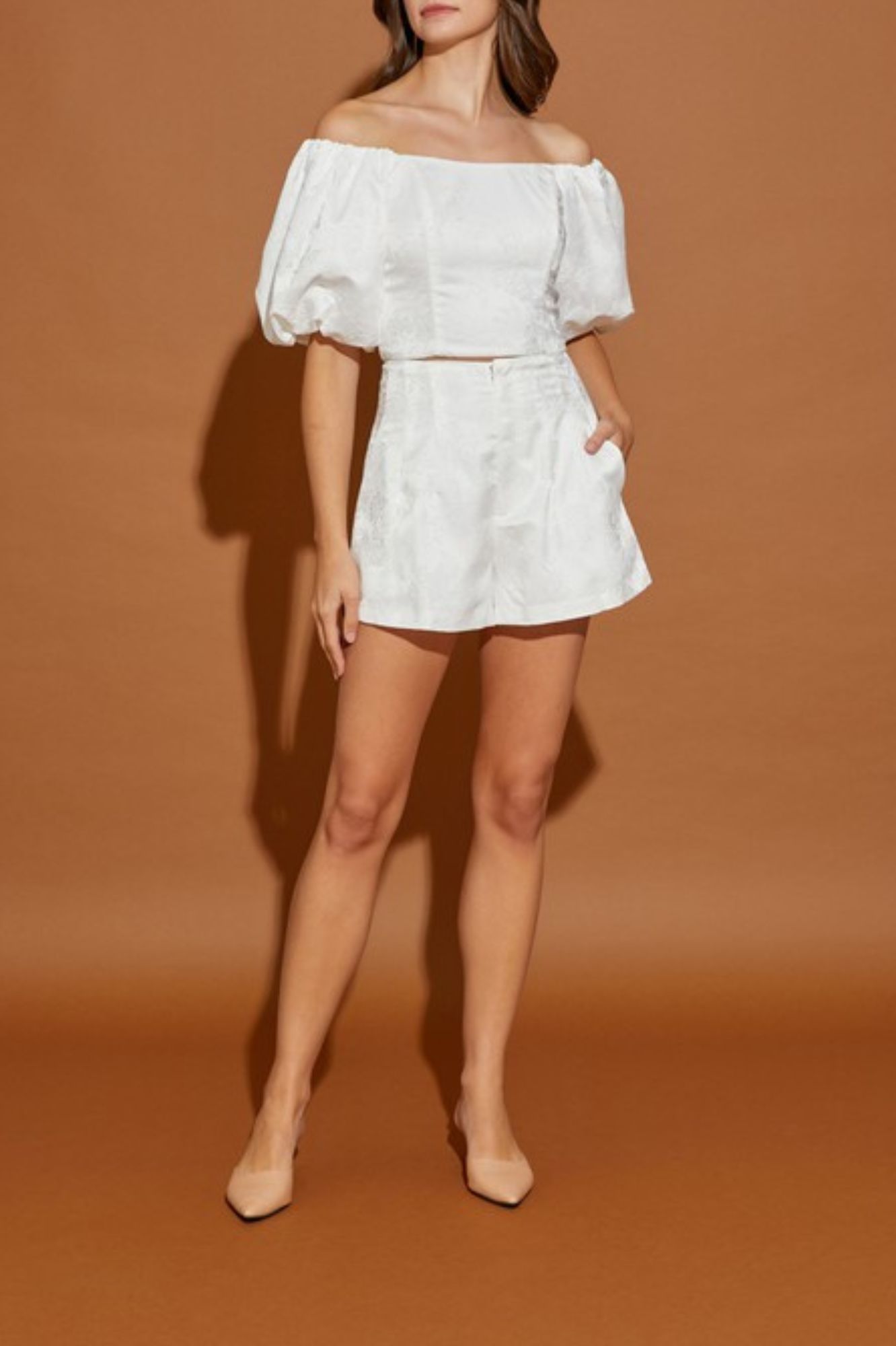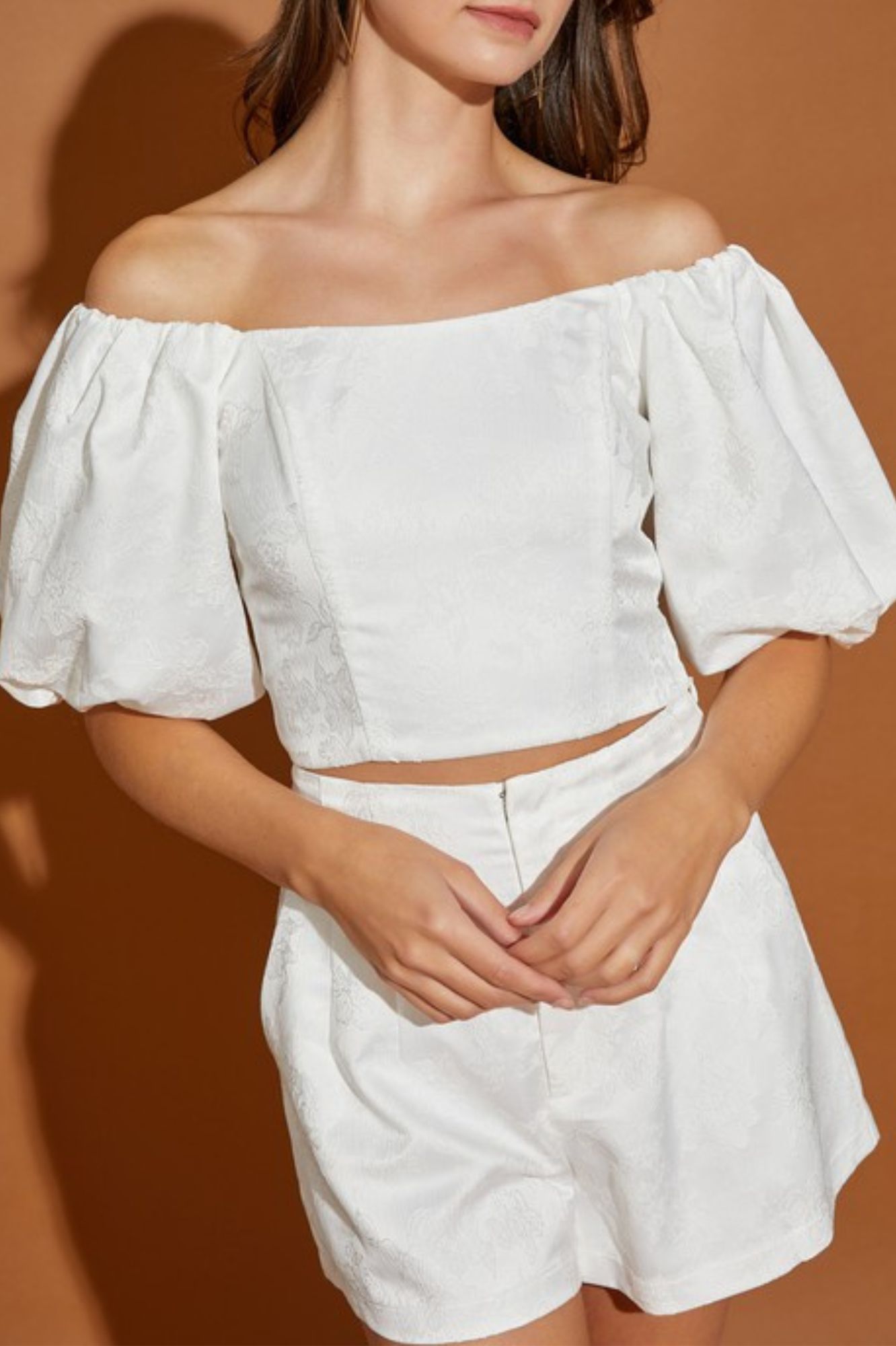 JACQUARD OFF SHOULDER CROP TOP AND SHORT PANTS SET