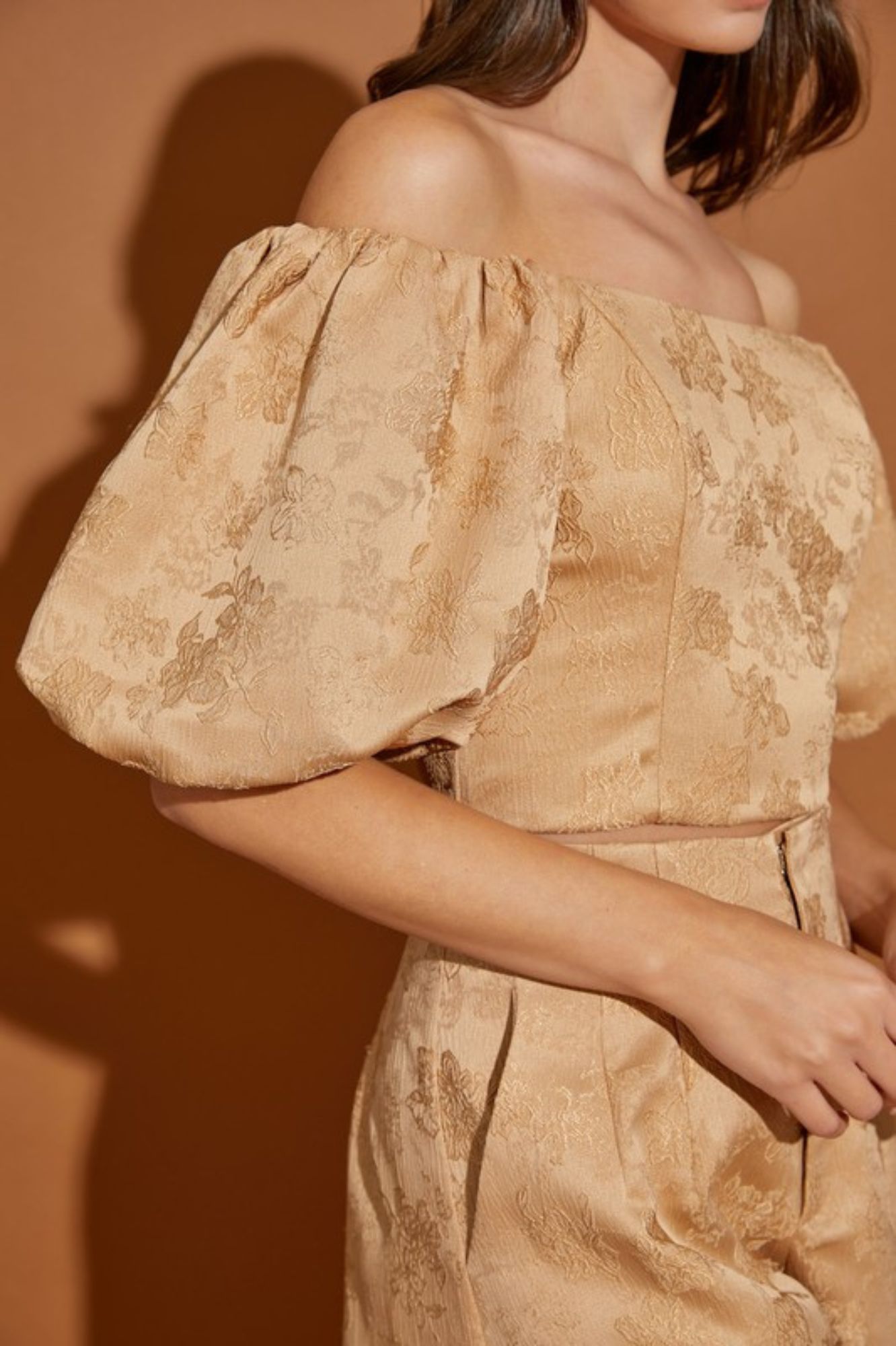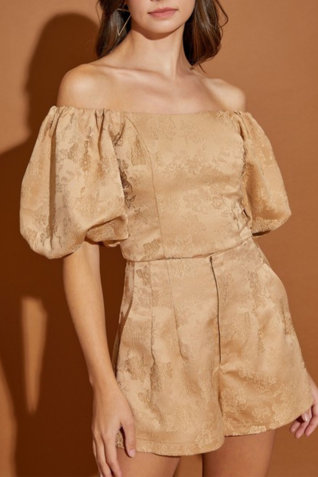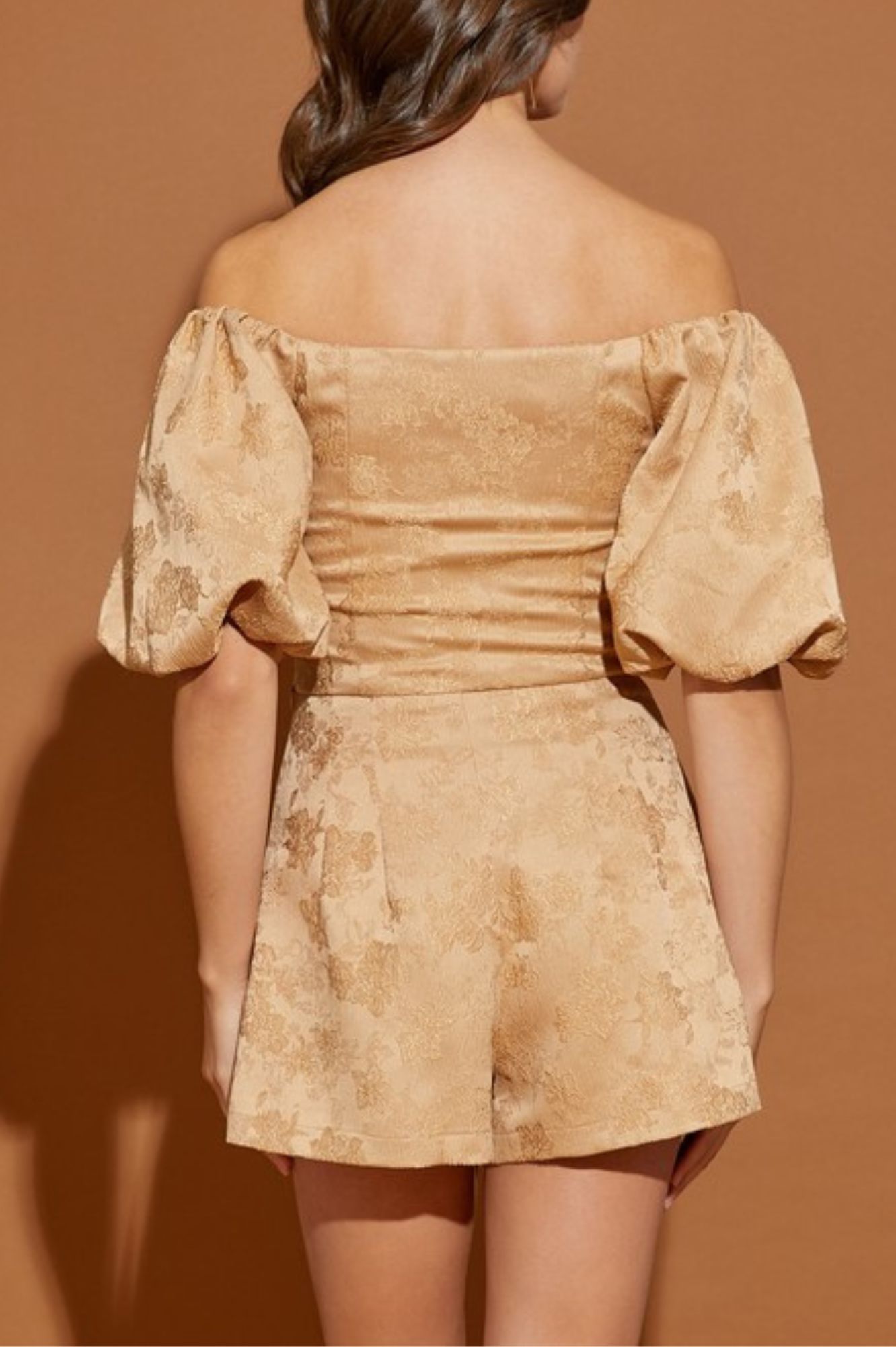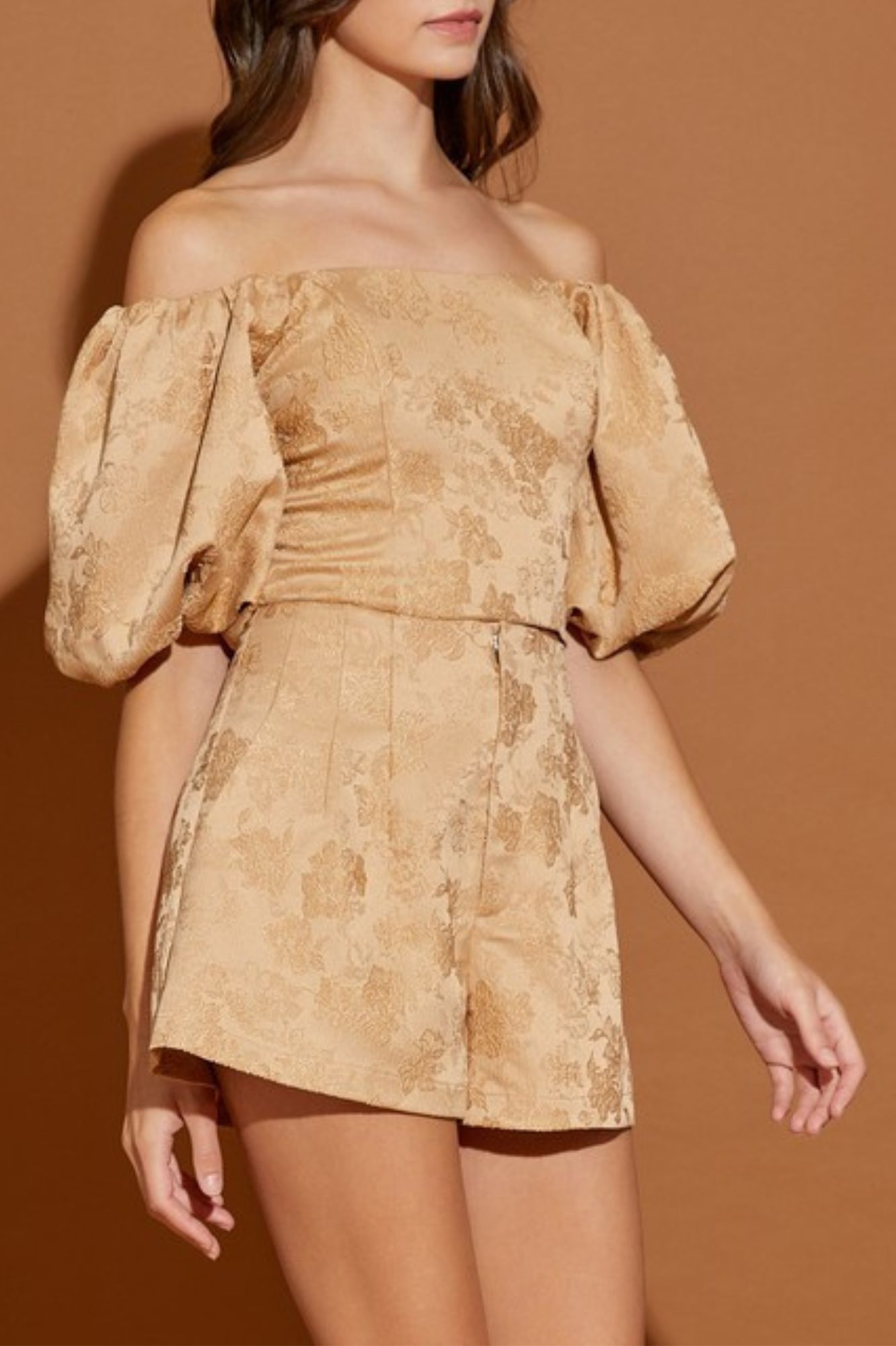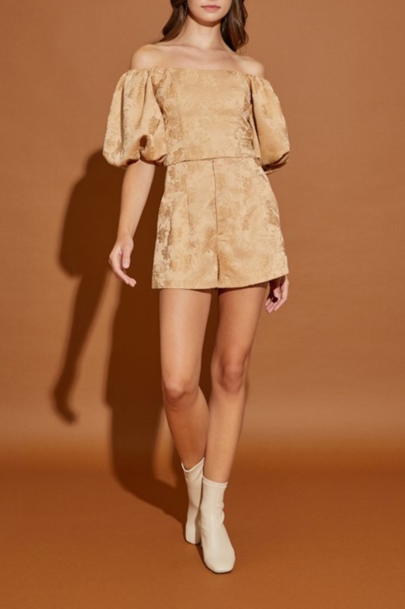JACQUARD OFF SHOULDER CROP TOP AND SHORT PANTS SET