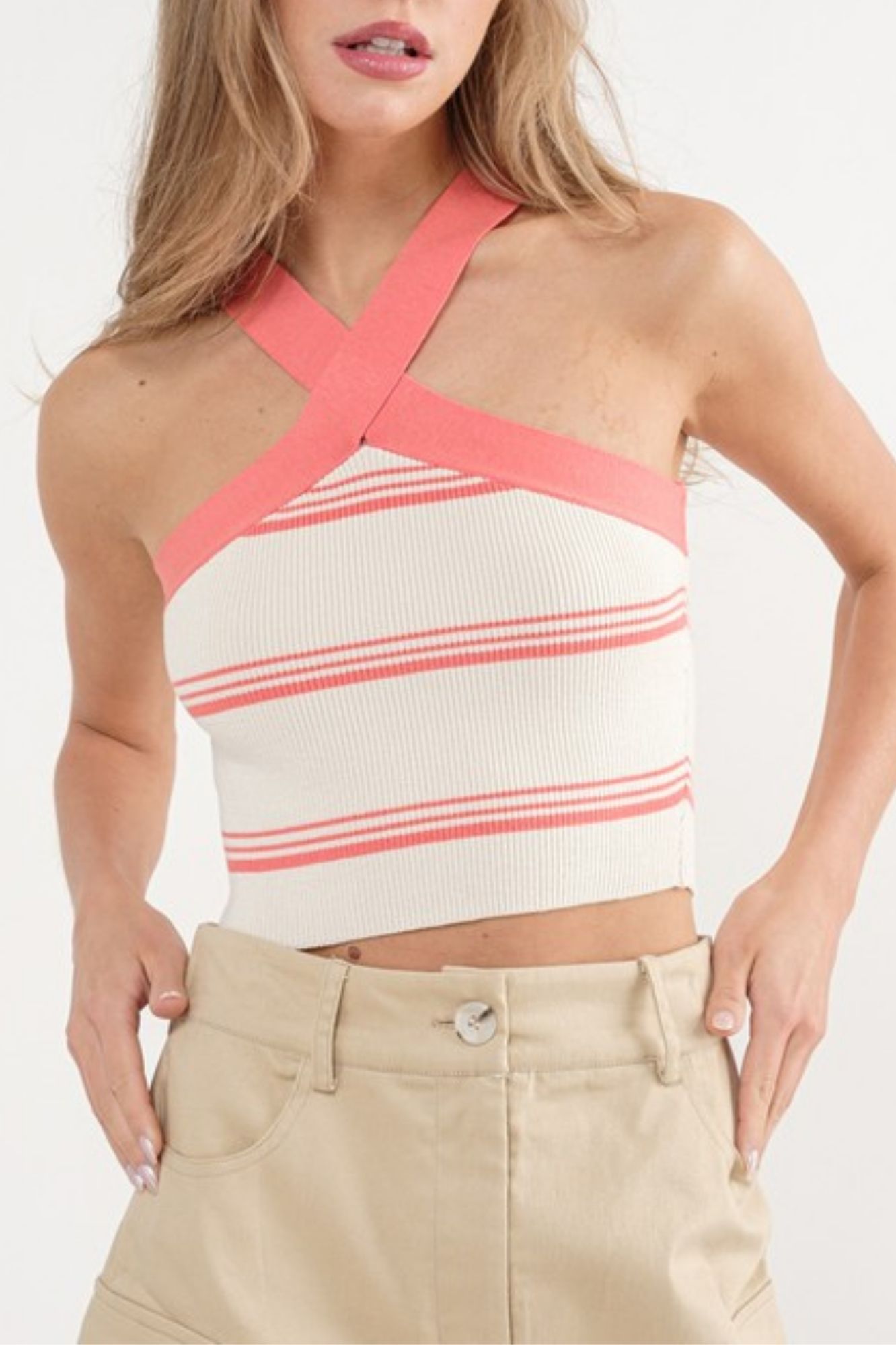 ORANGE SCULPT KNIT CRISS STRIP CROPPED RIB TANK