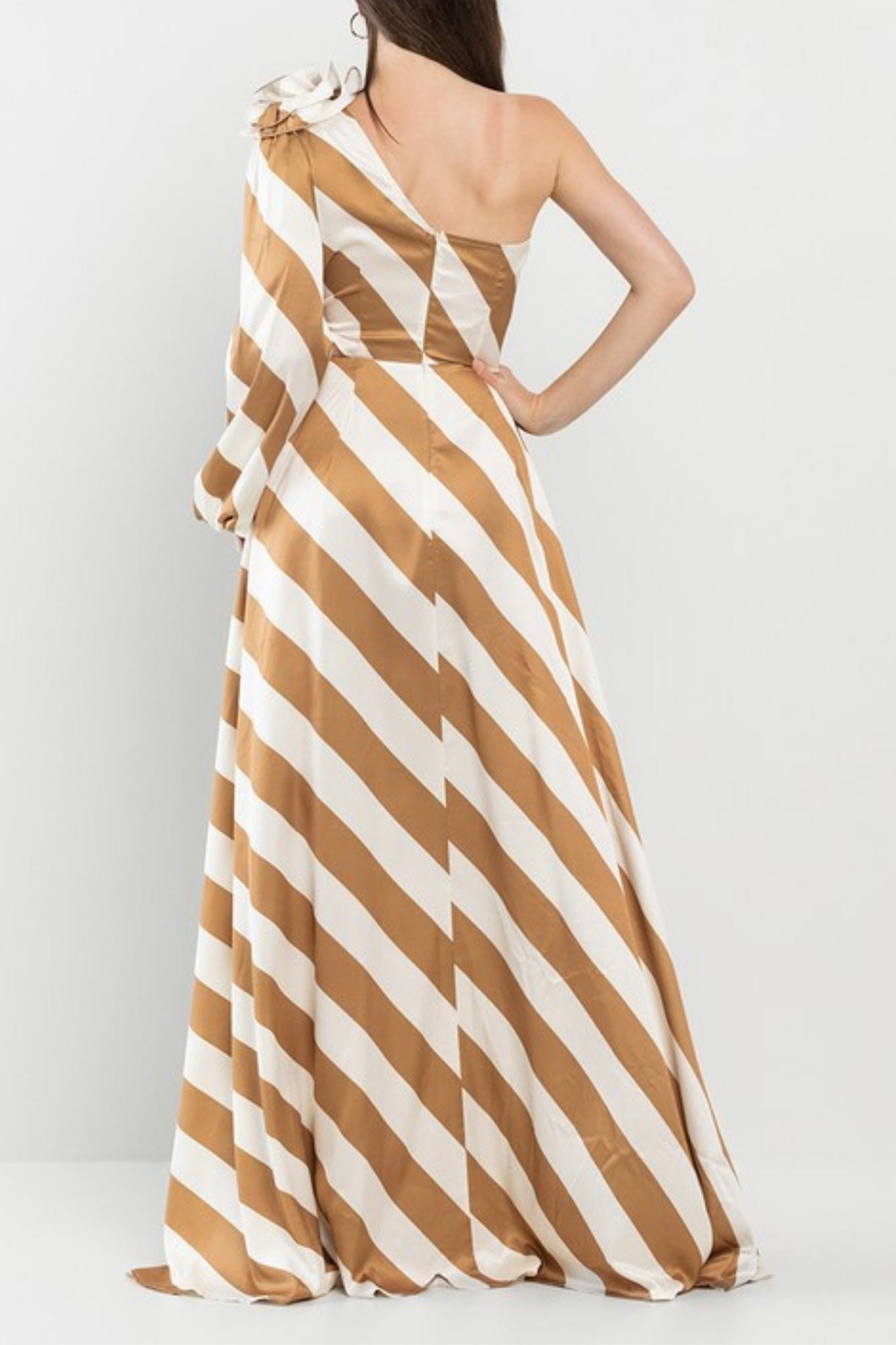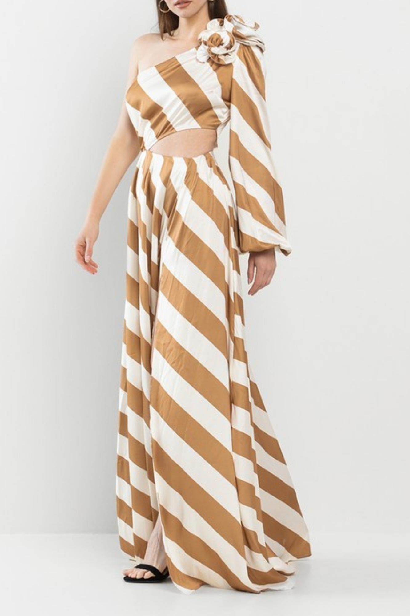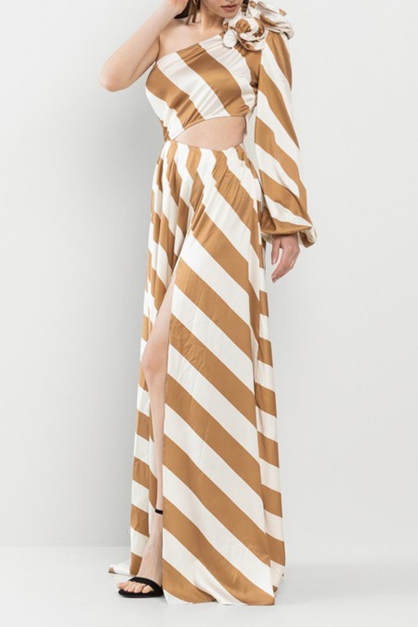STRIPE ONE SHOULDER MAXI DRESS CORSAGE ON SHOULDER